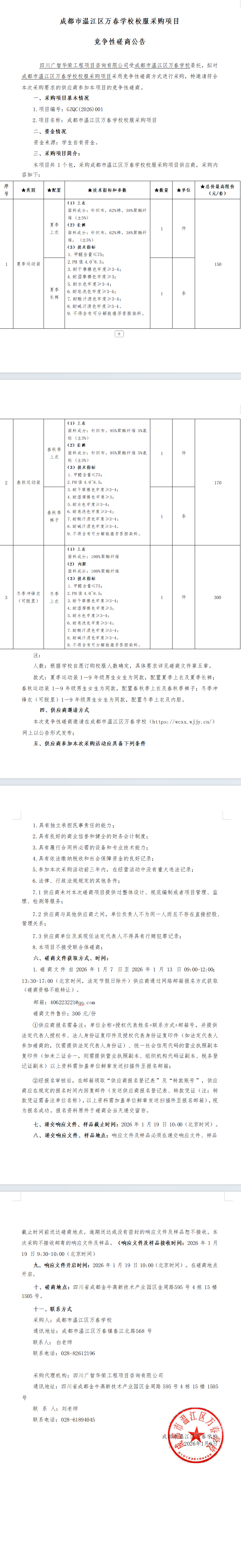成都市温江区万春学校校服采购项目竞争性磋商公告