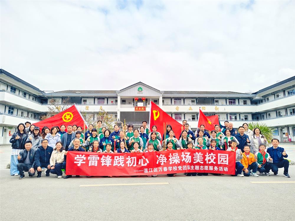 春风浩荡,万物生长。3月5日,第63个学雷锋纪念日,温江区万春学校的操场上迎来了一群特殊的“清洁工”。在学校党总支的引领下,15名党员教师、29名共青团员和10名少先队员代表集结成队,与他们并肩而立的是平日里默默奉献的学校保洁阿姨。这一天,讲台上下、课堂内外,身份被“劳动者”这一共同标签所融合,一场以“学雷锋践初心 净操场美校园”为主题的党团队志愿服务活动就此展开。